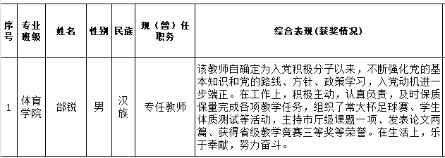 根据威尼斯官网发展党员的相关规定,经公共体育教工党支部推荐,院党总支审议,拟发展邰锐老师为中共预备党员,现将相关资料公示如下: