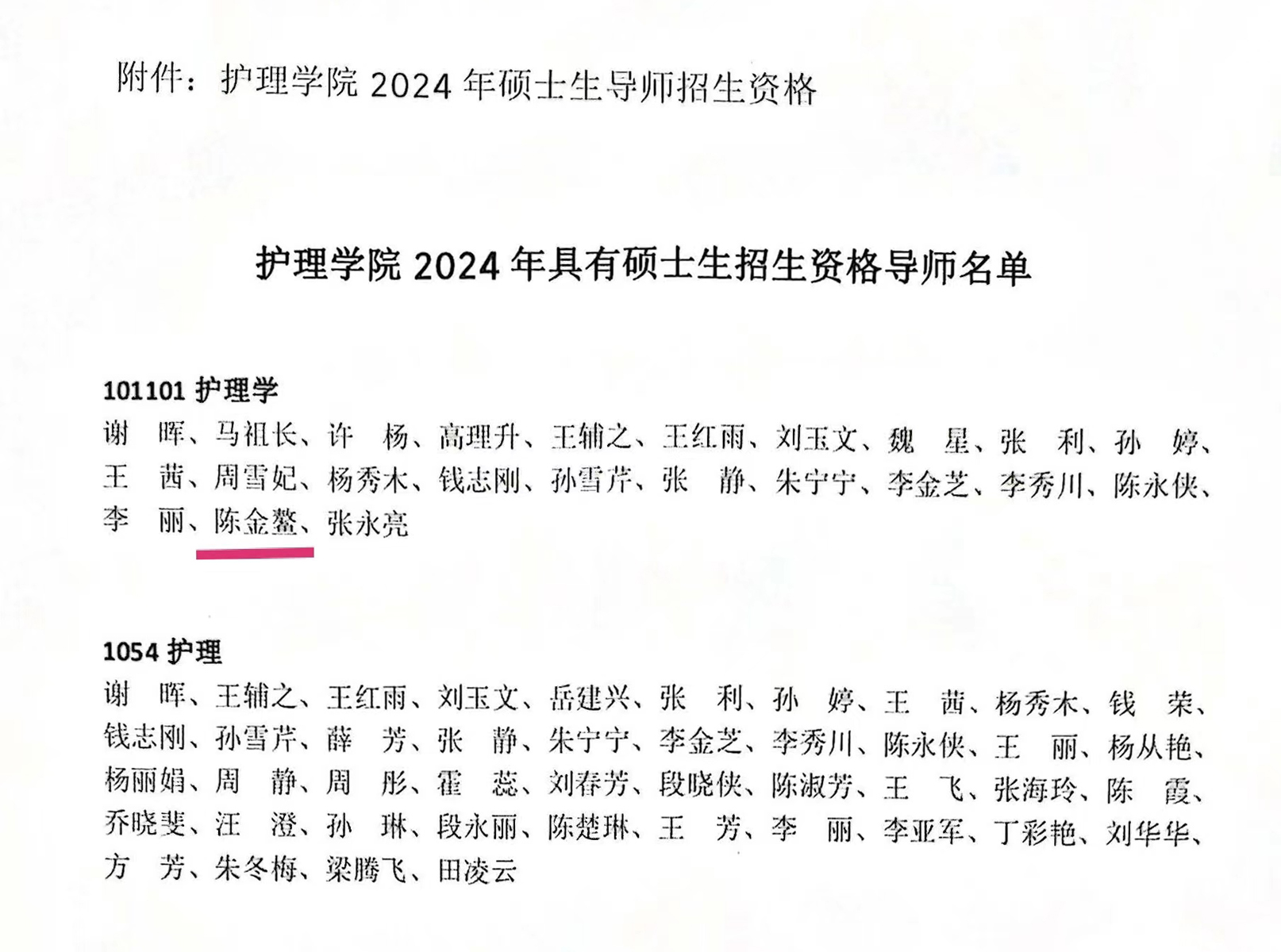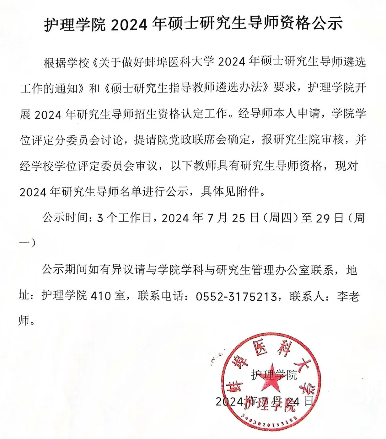 近日,蚌埠医科大学公布了2024年硕士研究生导师遴选结果,我院运动健康科学实验中心主任陈金鳌副教授经蚌埠医科大学护理学院学位评定分委员会讨论及党政联席会确定,报研究生院审核,并经学校学位评定委员会审议,受聘为蚌埠医科大学护理学院校外学术学位硕士研究生导师(101101护理学),具有2024年研究生招生资格,二级学科方向为健康与慢病管理学。据悉,本年度蚌埠医科大学护理学院共认定51名教师具有2024年硕士研究生招生资格,其中,具有学术学位硕士研究生招生资格的导师23名。